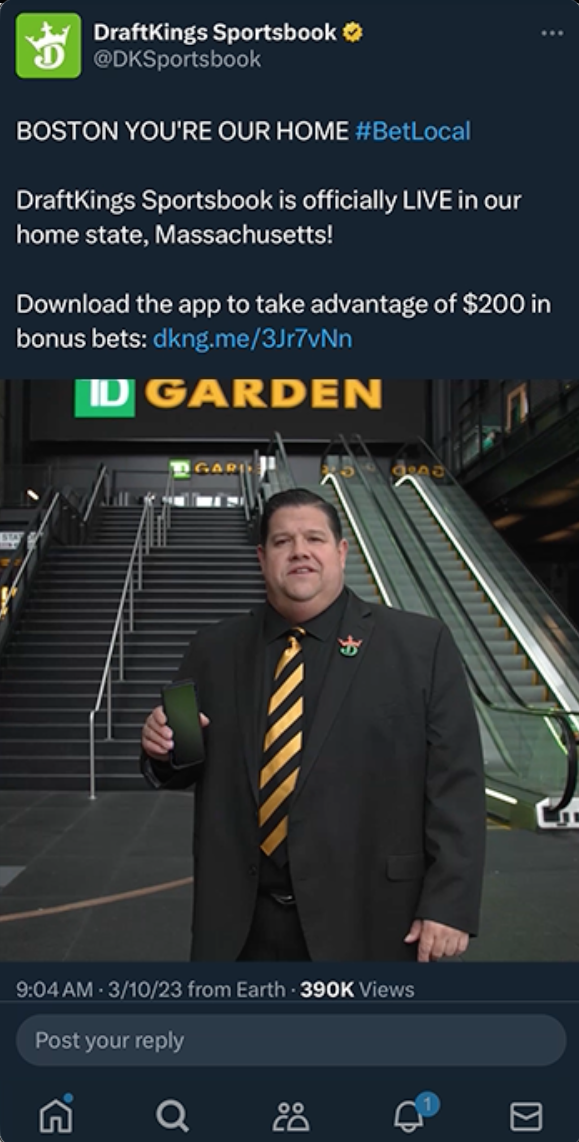 DraftKings was founded in Boston in 2012. So when sports betting was finally legalized in Massachusetts in 2022, it was a huge deal. We created an integrated campaign “BET LOCAL” to remind Mass folks that we are the authentic hometown sportsbook. And we used a cast of Boston sports heroes from Red Sox Hall of Famer David Ortiz to Bruins legend Zdeno Chara to Olympian Aly Raisman.
